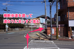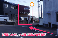 信号右折後すぐに右手に細道があるので、右折をしていただくと、赤レンガ調の3階建ての建物がございます。1階左部分が当事務所となります。
